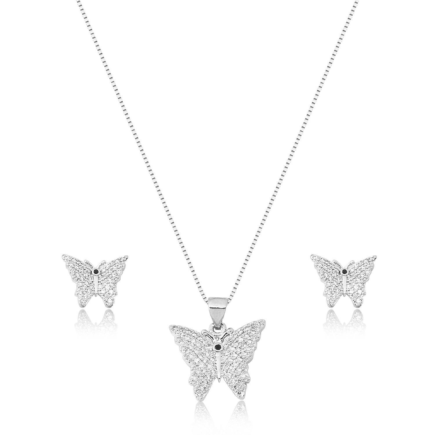 Conjunto de colar com pingente de borboleta com pedras de zircônia. Com brinco com pedras de zircônia que traz um ar delicado porém com muito brilho.